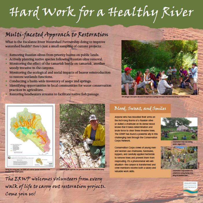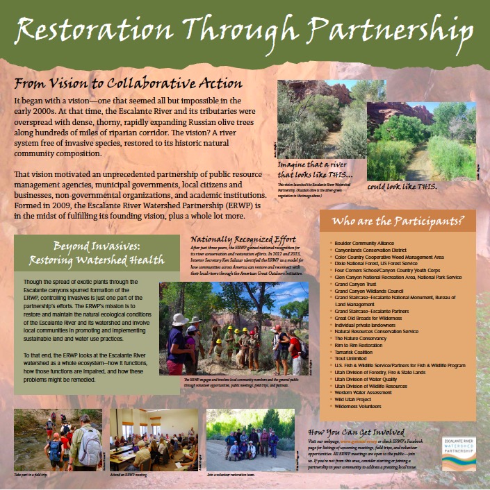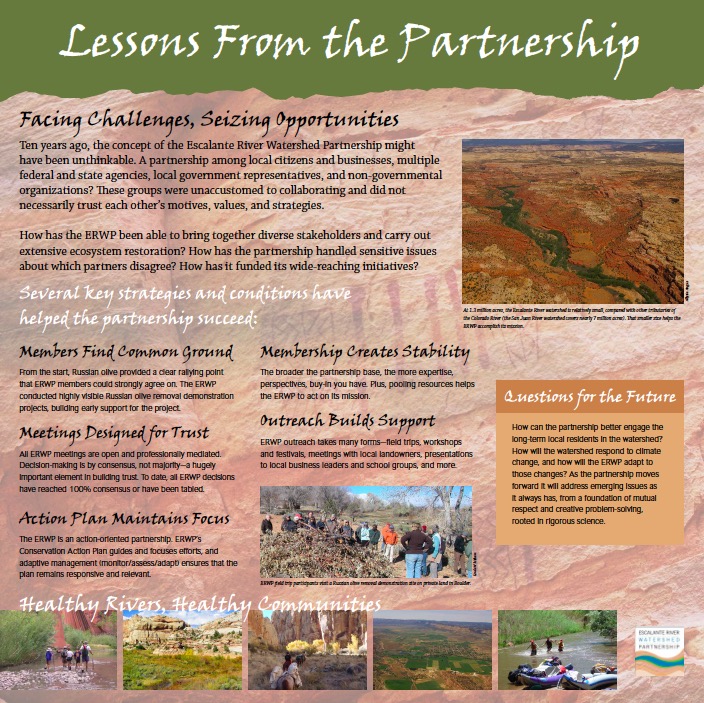 Graphic designer Maja Smith and I developed five panels for the Escalante Interagency Visitor Center in Escalante, Utah, to showcase the vision, strategies, actions, and outcomes of the Escalante River Watershed Partnership. To launch this project, I facilitated a charette among partnership members to gather input for panel content.