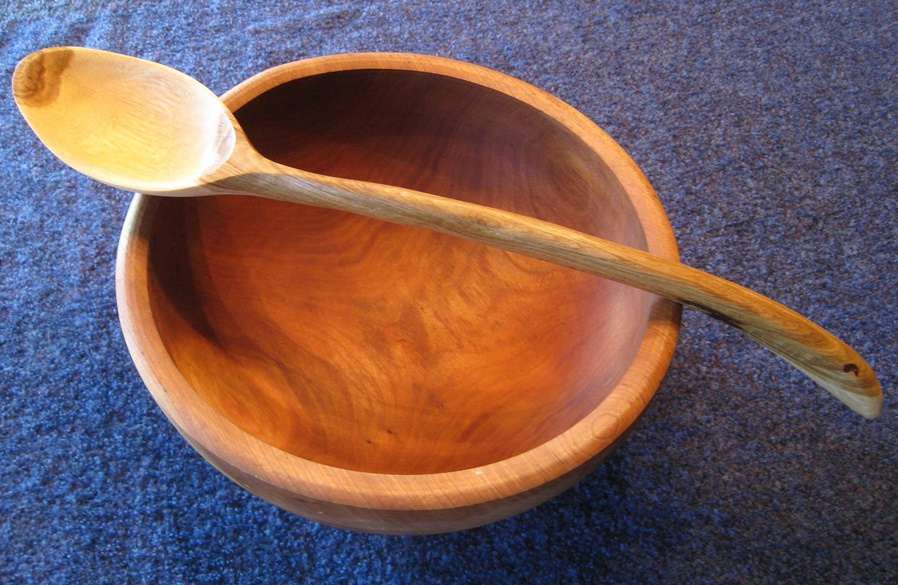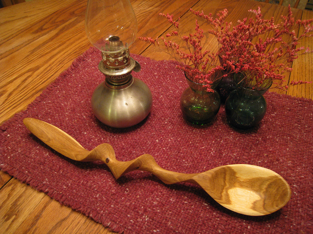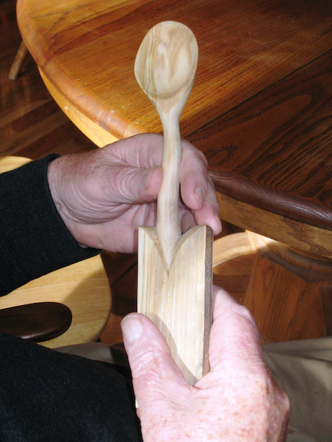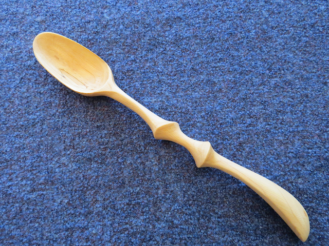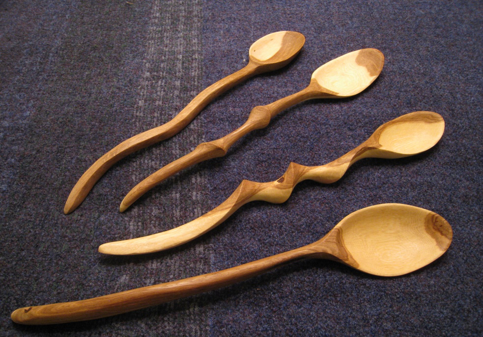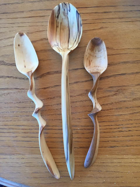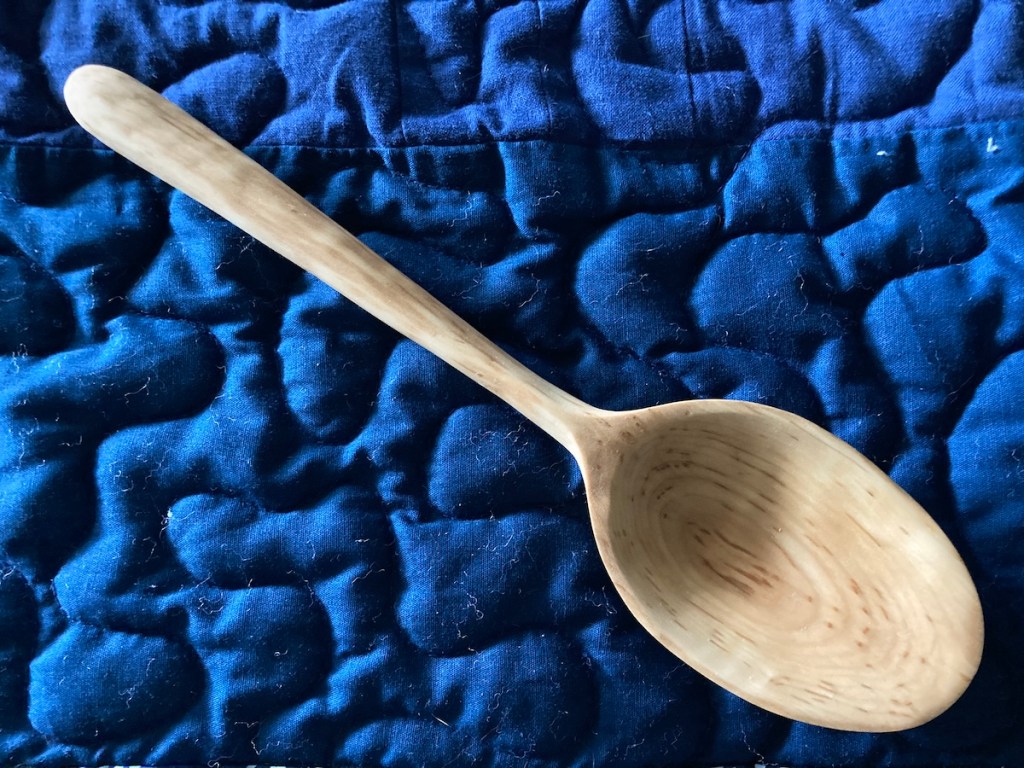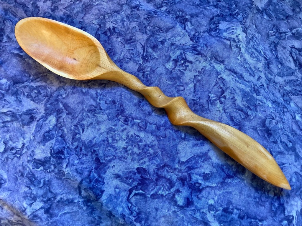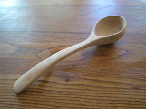I love carving spoons with hand tools: a coping saw and hatchet to shape the wood, a straight knife, a curved spoon knife, and sandpaper. Since I started carving birds in 2014, I’ve added a beautiful set of palm carving tools. Here are a few examples of the spoons I’ve carved…