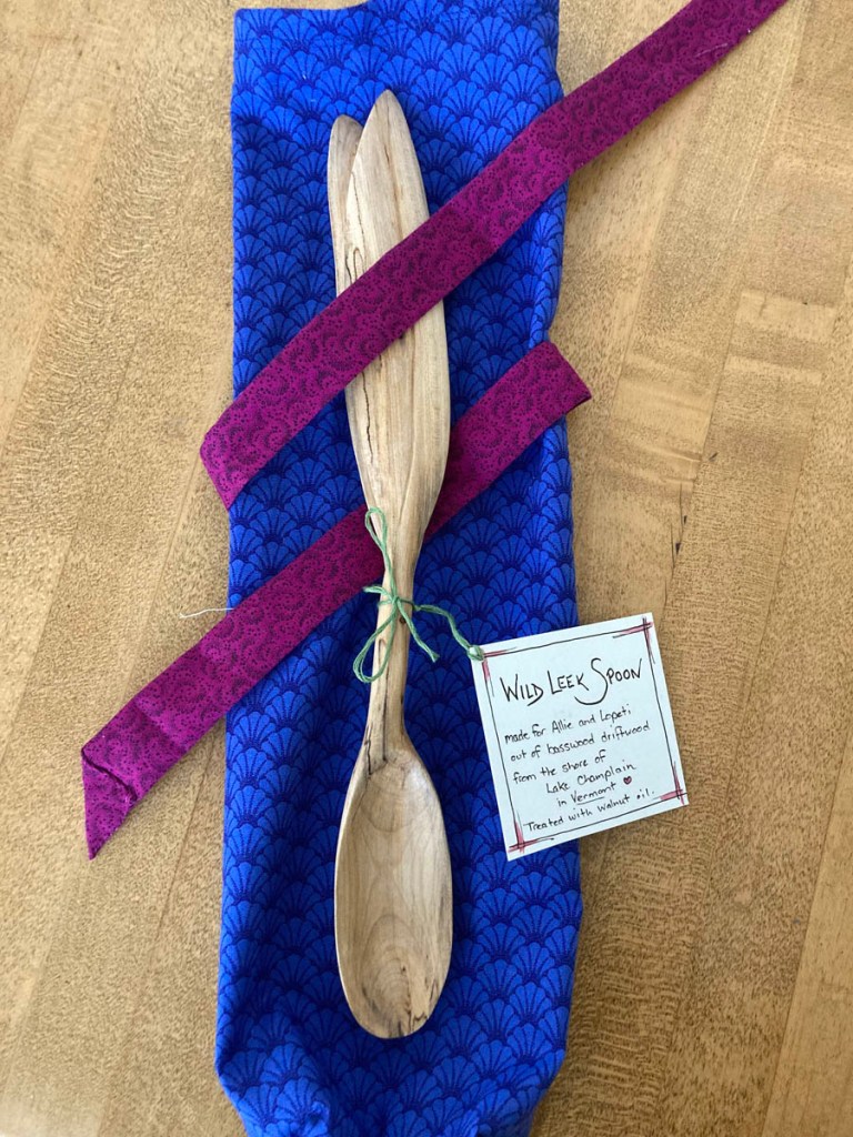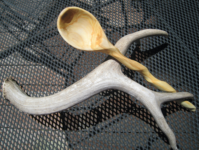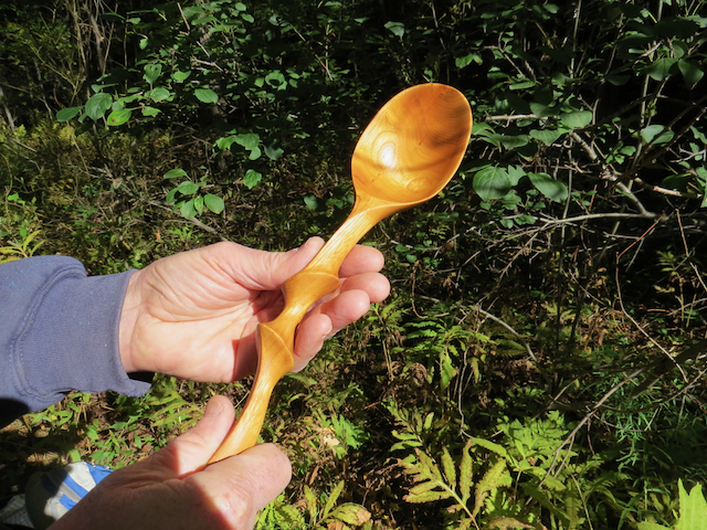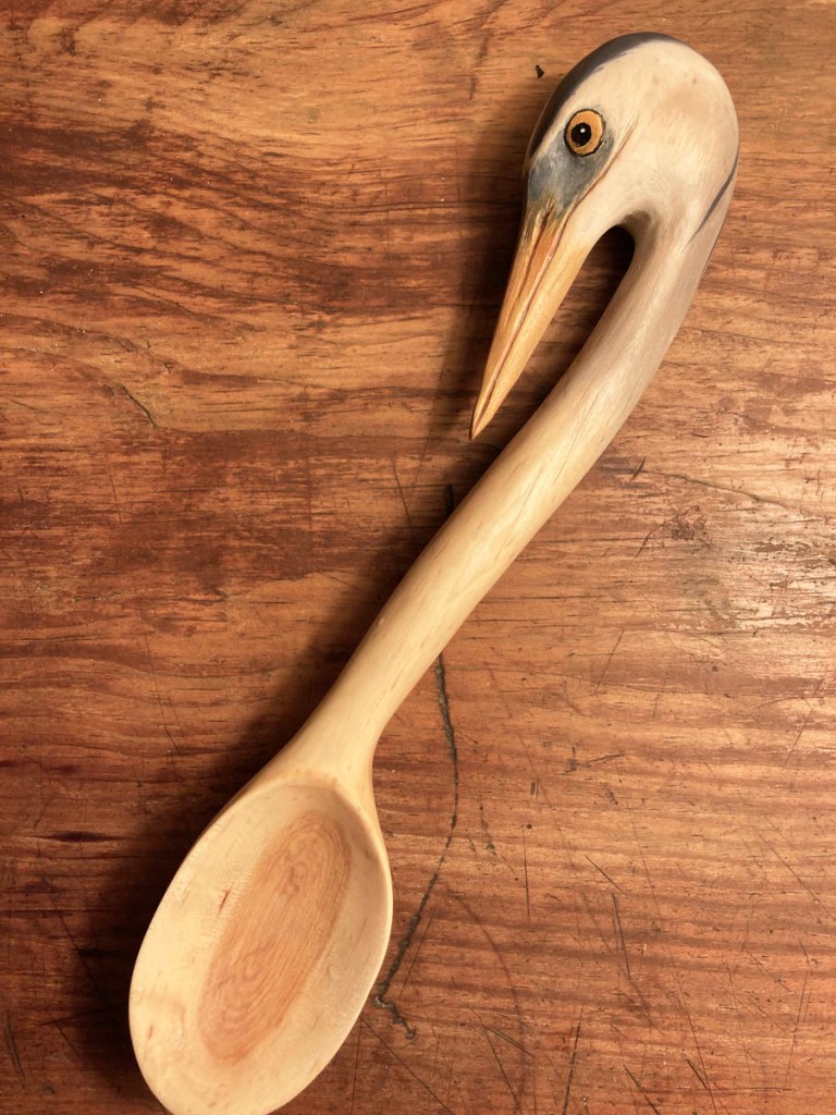 Great blue heron spoon, front. I experimented with intrinsic stains to create the bird’s colors. My new favorite thing–carving bird spoons. There are over 11,000 bird species in the world, and I’ve carved three so far. Better get to work!This blue-footed booby spoon started the bird-spoon series. Like most good projects, it was inspired by gratitude–to my brother and sister-in-law, who took me to the Galapagos with them. I didn’t have any special carving tools at that time for making the head, so its detailing is quite simple.Inspired by the beautiful shape of wild leeks, I carved this spoon as a wedding gift, using driftwood (perhaps basswood). I especially liked the freckle of dark wood in the handle of this spoon.Buckthorn is considered an invasive exotic here in Vermont, but it’s my favorite spoon wood–look at that warm color!Another buckthorn spoon, made for a wonderful ecologist retiring from a long career with the state of Vermont.Some interesting colors in this aspen.Gambel oak spoon (one of the “Sibling Spoons”). Like every other one I’ve made, I gave it to some friend or family member.I wanted to give my dad a spoon, but he wanted a talking stick, so we compromised, and I made a talking stick that is a spoon emerging from a block of aspen. The bark is still on the wood at the base. Many hands have held that spoon, since my dad used it for years in the workshops he led.