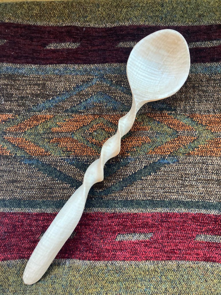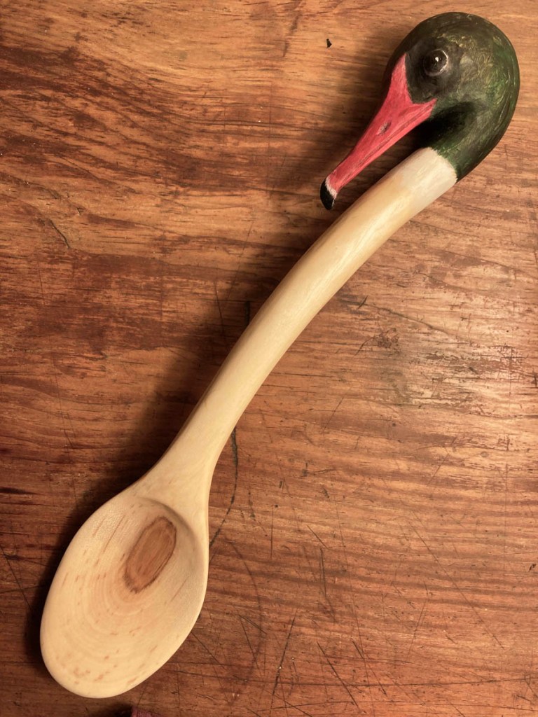 Common merganser. The process of painting the head brought so much more awareness of the bird’s form. I had never noticed the black tip to the bill, or the touch of white just behind that black.My sister Paula and her wife Deb had an immense white ash in their front yard that the town cut down to widen the road. Paula saved me a piece of the wood, and I carved a spoon for them. I traded with a friend of mine–my spoon for his beautiful shingle hatchet.More buckthorn–such luminous grain.While chopping firewood, the patterns on this chunk of red maple caught my friend’s eye. The zoomy patterning is called “tiger maple.”The simple form works well for this wide- and shallow-bowled spoon.I called these the Sibling Spoons. Four spoons, all carved out of the same round of Gambel Oak, cut from a fallen branch I found in the forest. They share the same heartwood, like my four beloved siblings.Half-finished set of salad tongs made of aspen, inspired by the beautiful shapes of Gambel oak leaves.My first attempt at the spiral form, in aspen, way back when. I was quickly hooked by spirals!My very first spoon, of black birch. It was a bear to carve, since I only had a Swiss army knife at that time and the wood was really hard. Despite the long hours, I was smitten.