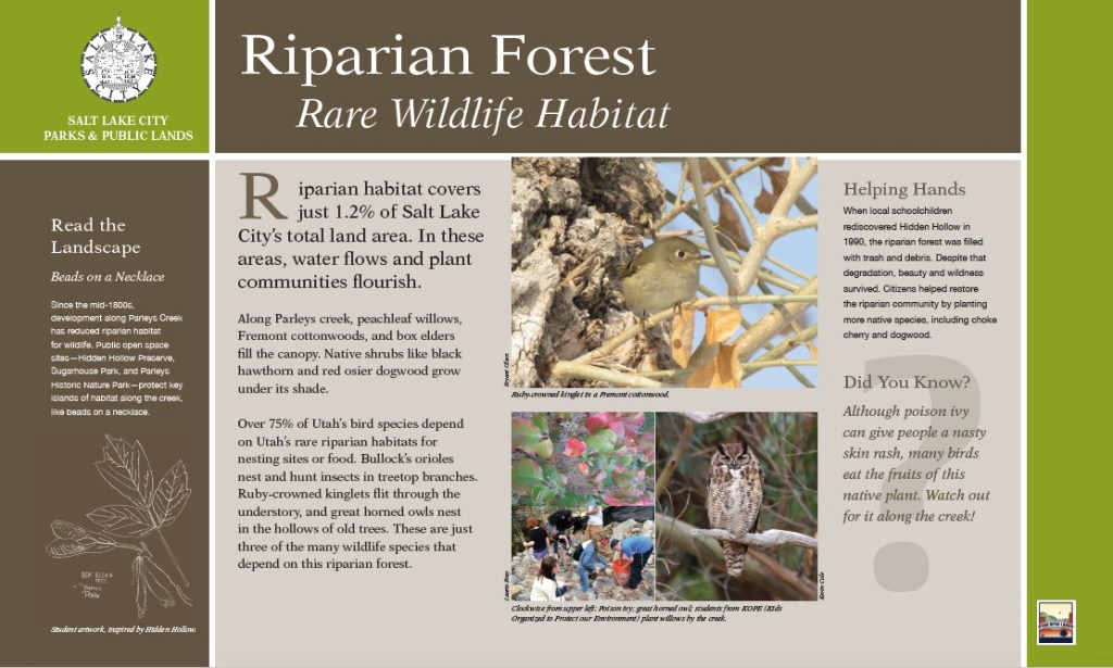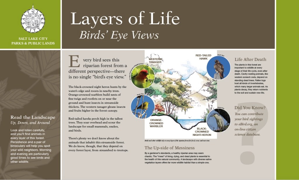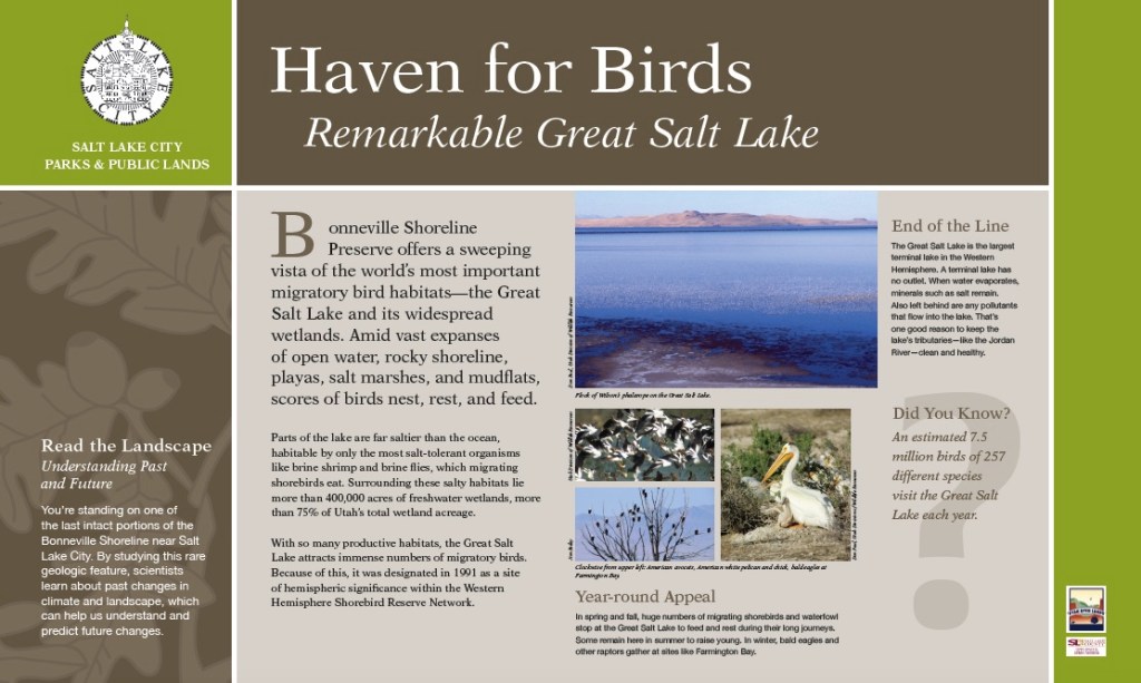 As part of the Landmark Design project team, Maja Smith and I developed an interpretive framework, 52 interpretive panels, and 42 orientation panels for Salt Lake City’s open space lands, and contributed to a signage design standards guide for all Salt Lake City open space lands.